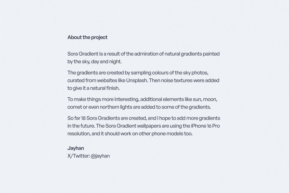 So far 18 Sora Gradients are created, and I hope to add more gradients in the future. The Sora Gradient wallpapers are using the iPhone 16 Pro resolution, and it should work on other phone models too.